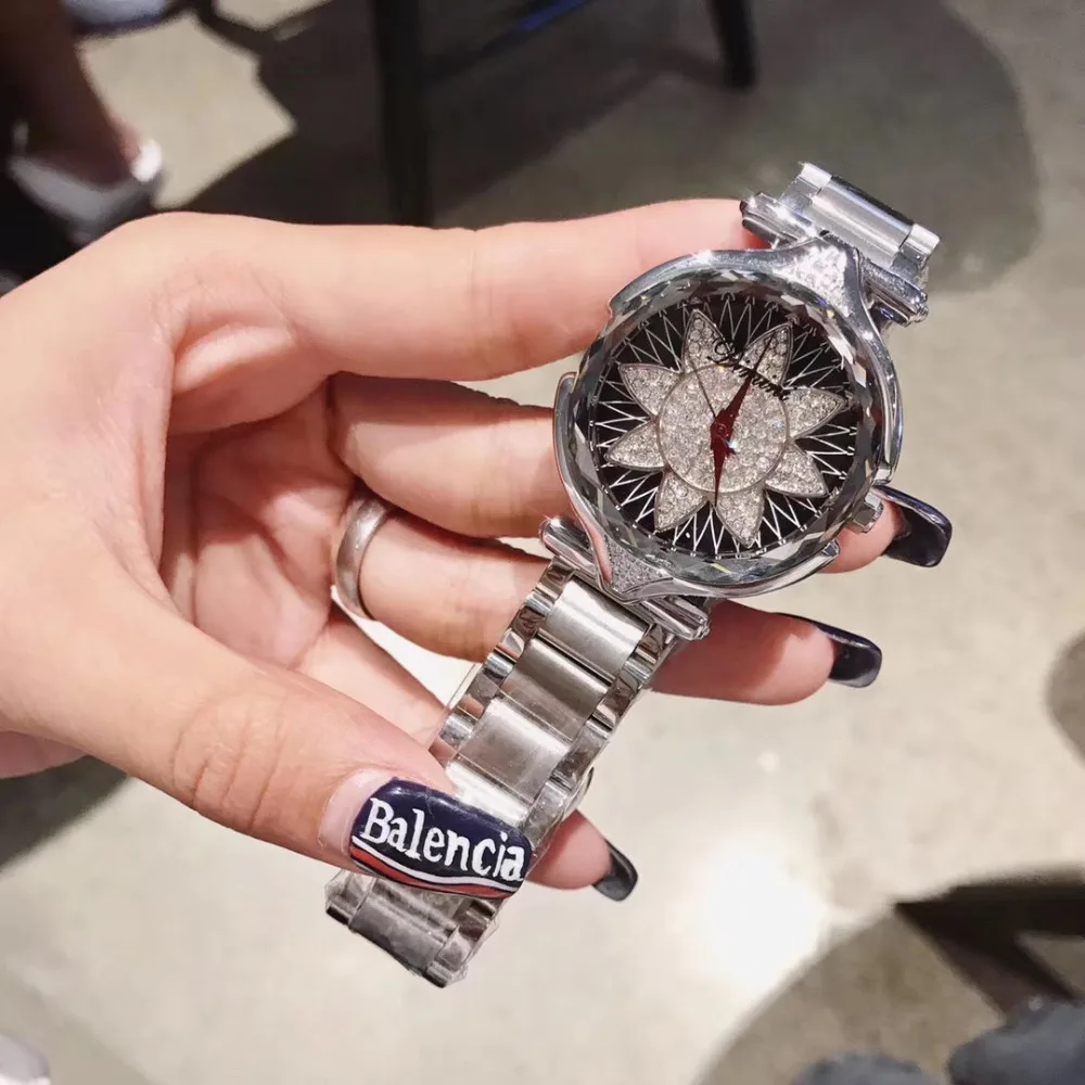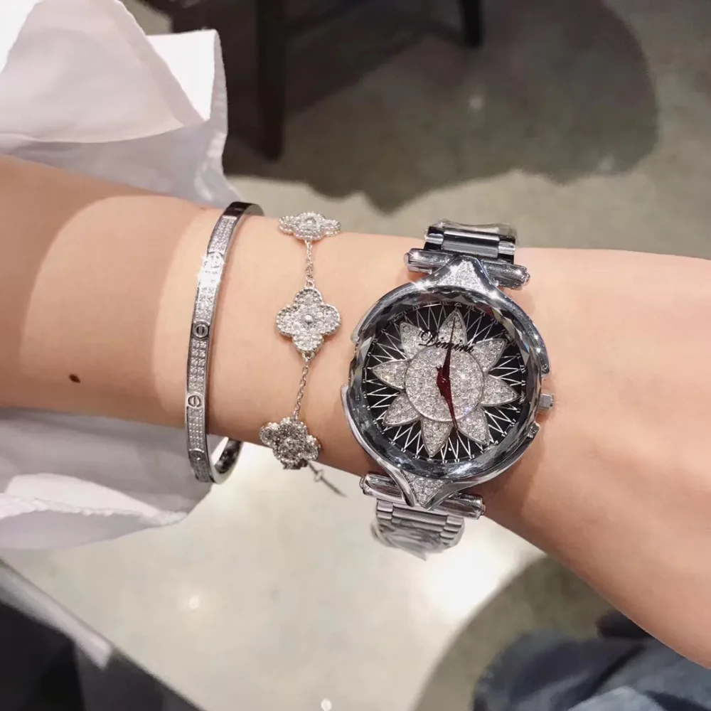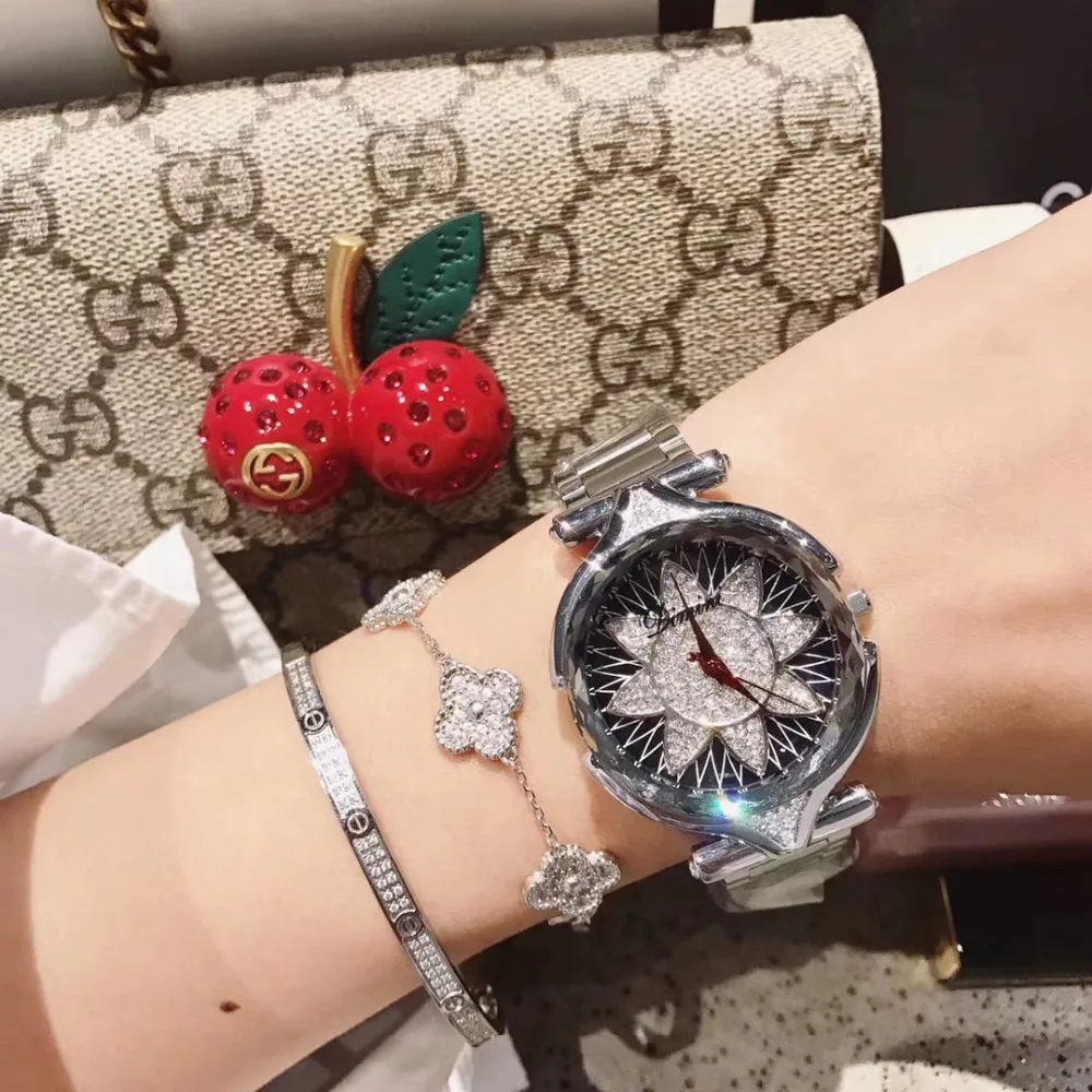 Brand Fashion Women Full Steel Watches Sunflower Crystals Wristwatch Multi Faceted Glass Waterproof